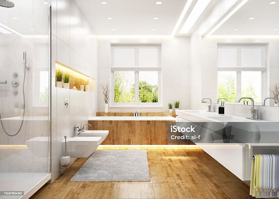 - Sanitäranlagen im Bad – Waschbecken, Dusche, WC, Badewanne